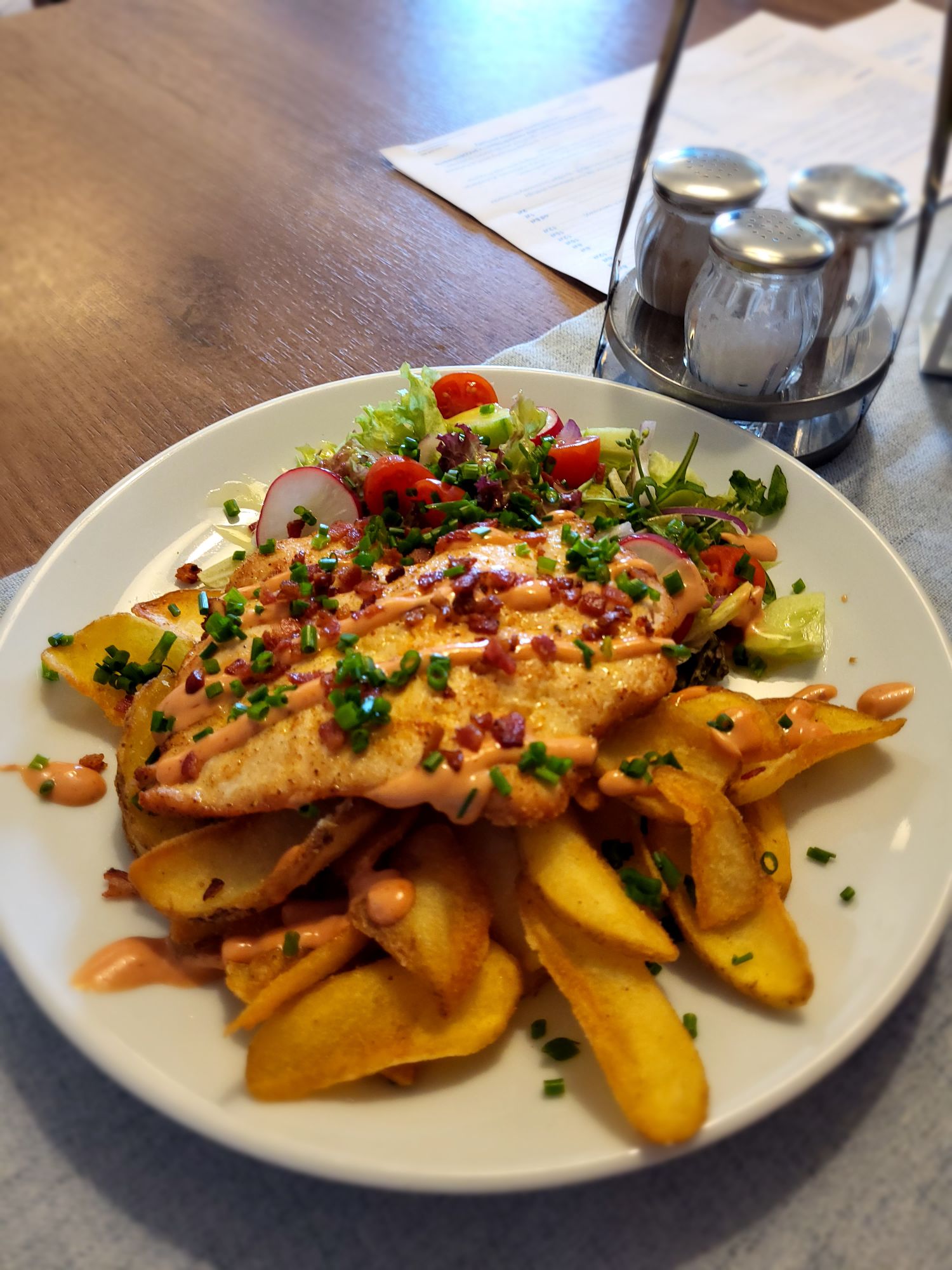 • Grillowany filet drobiowy (160g) z sosem 1000 wysp, ze scoopsami ziemniaczanymi i sałatką vinaigrette