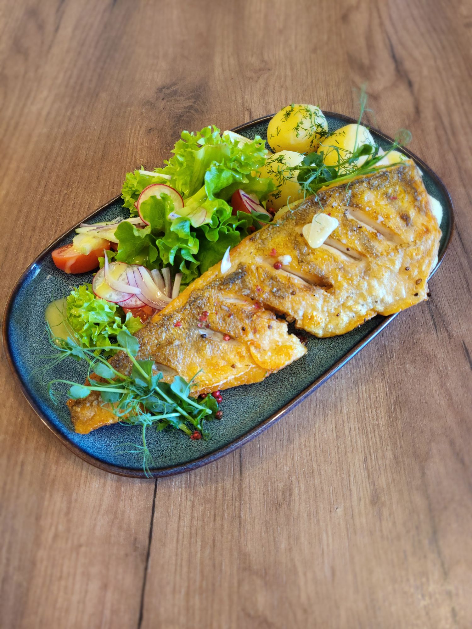 Sandacz (160g) w maśle czosnkowym z ziemniakami i sałatką vinaigrette