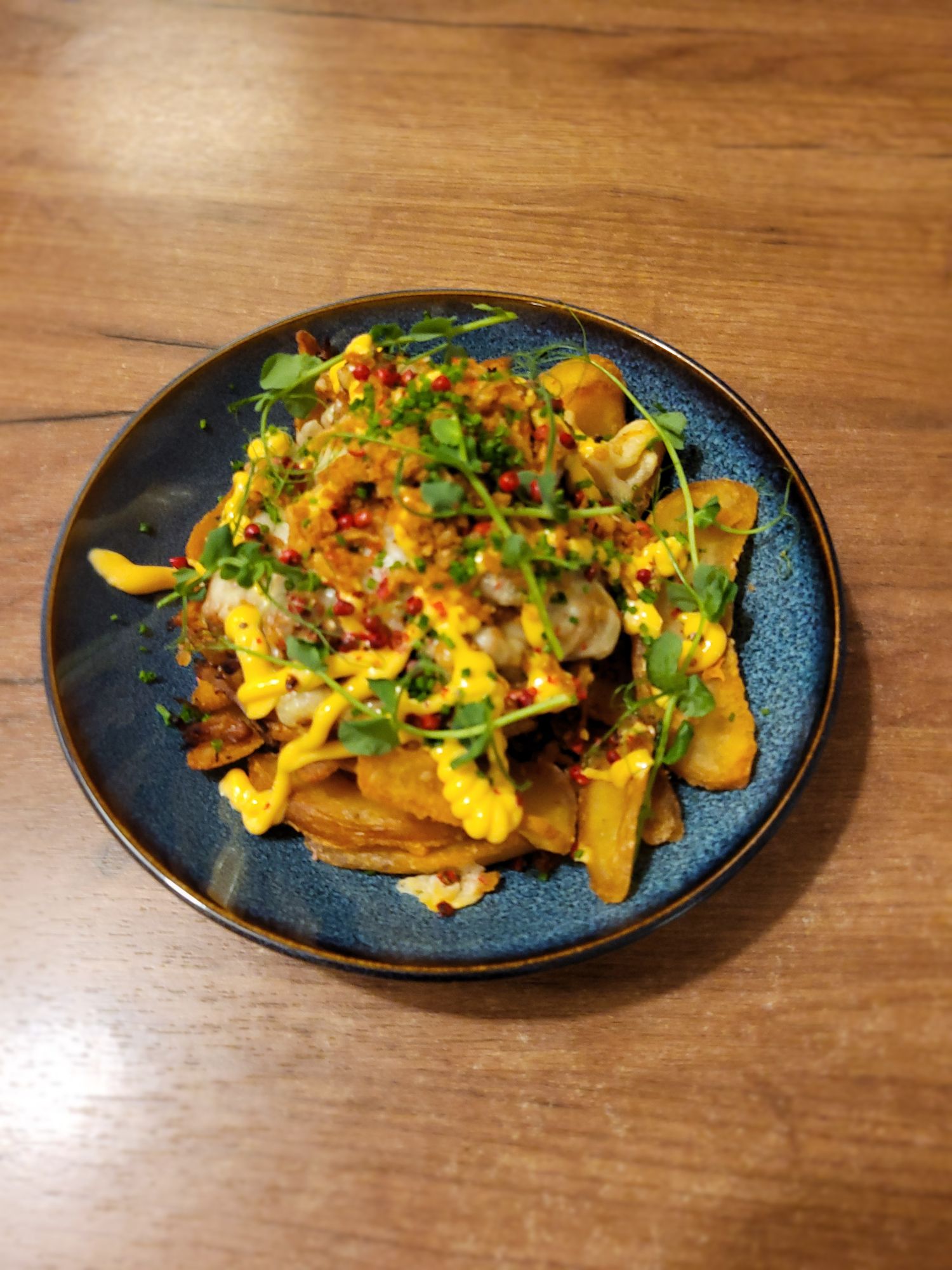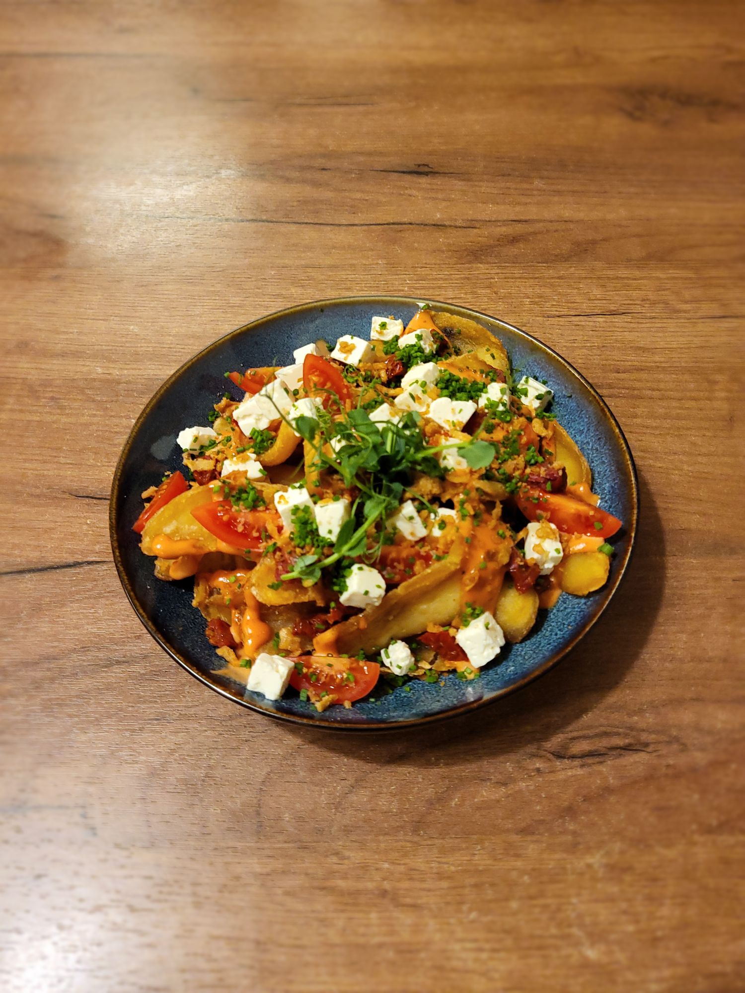 • Talerz frytek z sosem i posypką, udekorowany świeżymi ziołami i przyprawami na drewnianym stole.