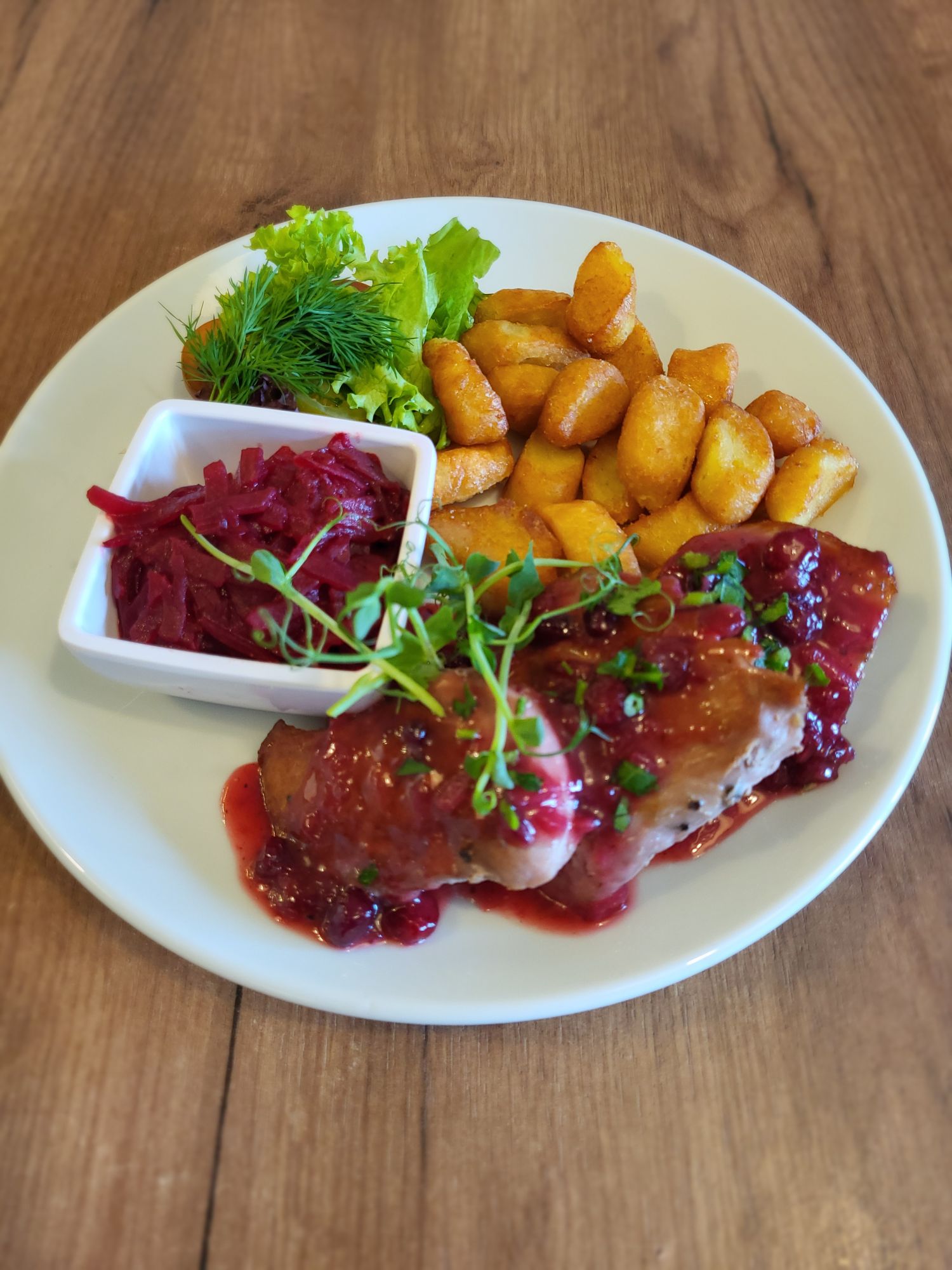 • Polędwiczka wp.(160g) w sosie żurawinowym ze smażonymi kopytkami i burakami zasmażanymi