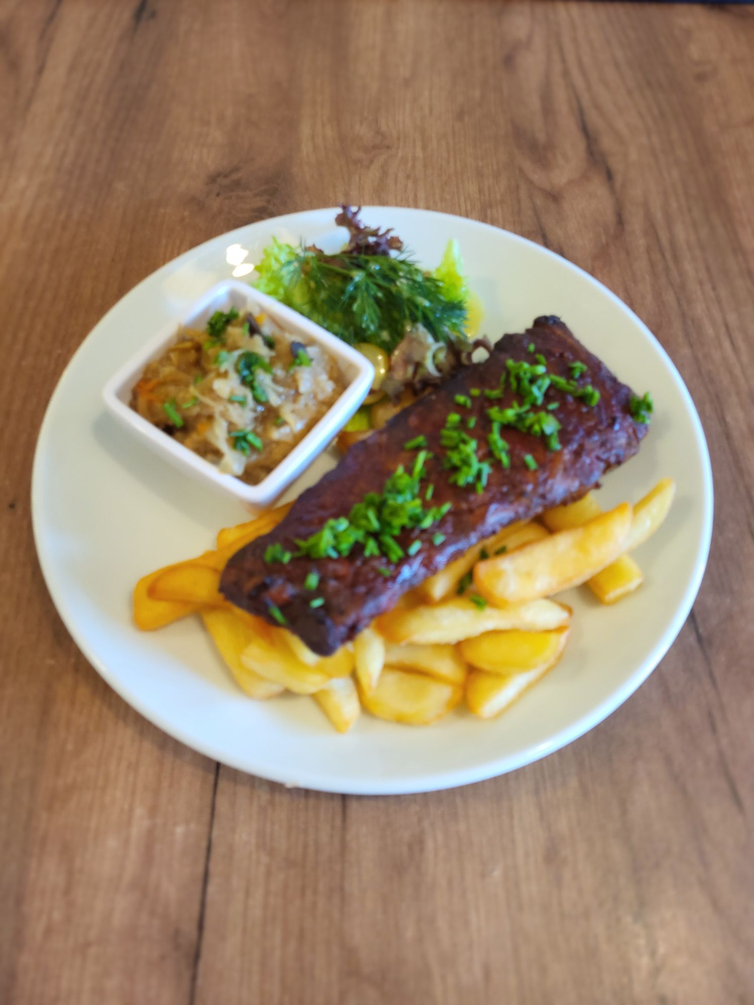• Żeberka wieprzowe w sosie BBQ (350g) z frytkami i zasmażaną kwaśną kapustą