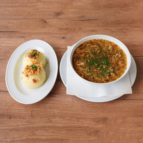• Cepeliny z mięsem wieprzowo-wołowym (3szt.) i zasmażaną kwaśną kapustą